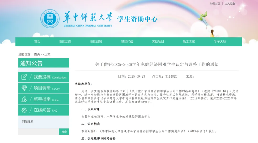 根据教育部等六部门《关于做好家庭经济困难学生认定工作的指导意见》(教财〔2018〕16号)文件精神,结合《关于做好2025-2026学年家庭经济困难学生认定与调整工作的通知》及《华中师范大学普通本科家庭经济困难学生认定工作实施办法(2019年修订)》文件要求,经学生申请、民主评议、学院审核公示等环节,最终在全体本科生中评定特别困难144人、困难98人、一般困难37人,共279人。全体研究生中评定特别困难40人,困难28人,一般困难58人,共126人。