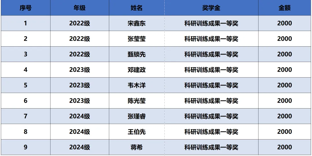 根据《华中师范大学物理学院拔尖基地班学生科研训练成果奖评选条例》,学院推进2024-2025学年基地班学生科研训练成果评审工作。共计87人获得,其中一等奖9人(奖励金额2000元),二等奖30人(奖励金额1200元),三等奖48人(奖励金额600元)。共计发放科研训练成果奖励8.28万元。