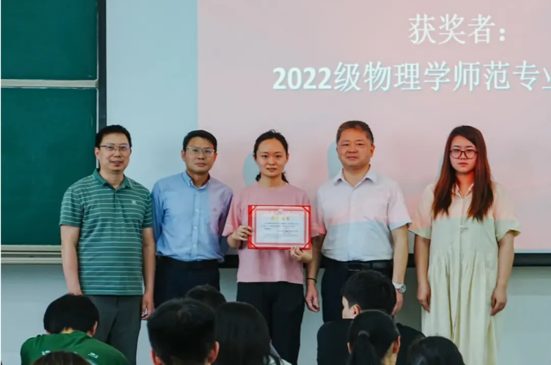 4月20日,物理科学与技术学院第八届“九三物理卓民奖学金”颁奖仪式在9401教室举行。“九三物理卓民奖学金”委员会秘书、学院副教授李安邦,学院1993级校友代表、华中师范大学第一附属中学黄淼老师,联想集团武汉产业基地张剑校友等出席颁奖仪式。2022级物理学师范专业的焦馨莹同学获得2025年第八届“九三物理卓民奖学金”,奖金1万元。