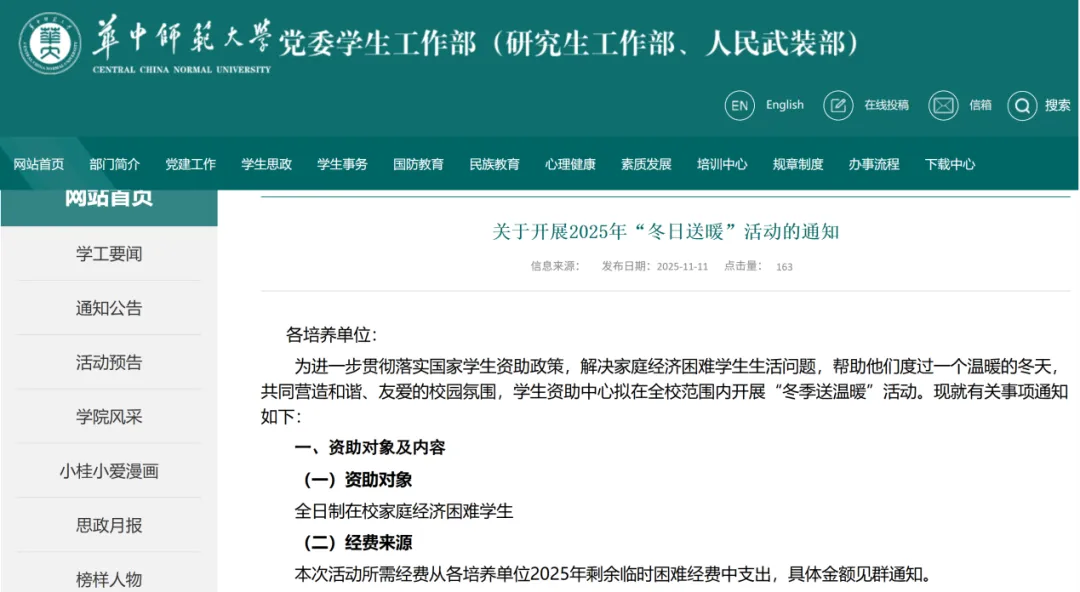 学校下发《关于开展2025年“冬日送暖”活动的通知》,学院正式启动2025年冬日送暖工作。经辅导员前期摸排、走访学生宿舍了解学生日常生活、访谈学生干部等环节,全体本研学生中共计发放临时困难补助以及冬日送暖补助12.63万元,覆盖学生300人次。